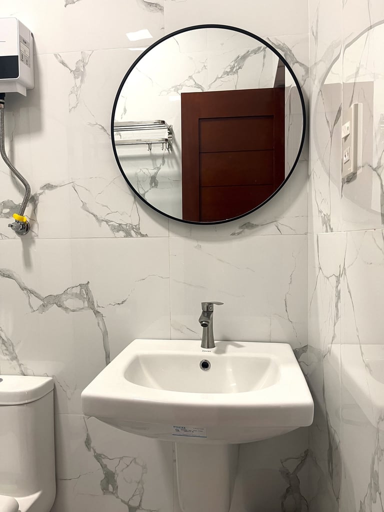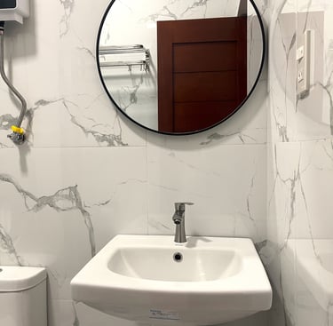 The bathroom is clean and well-equipped with a toilet, sink, hot and cold shower, and essential amenities for comfort and hygiene.