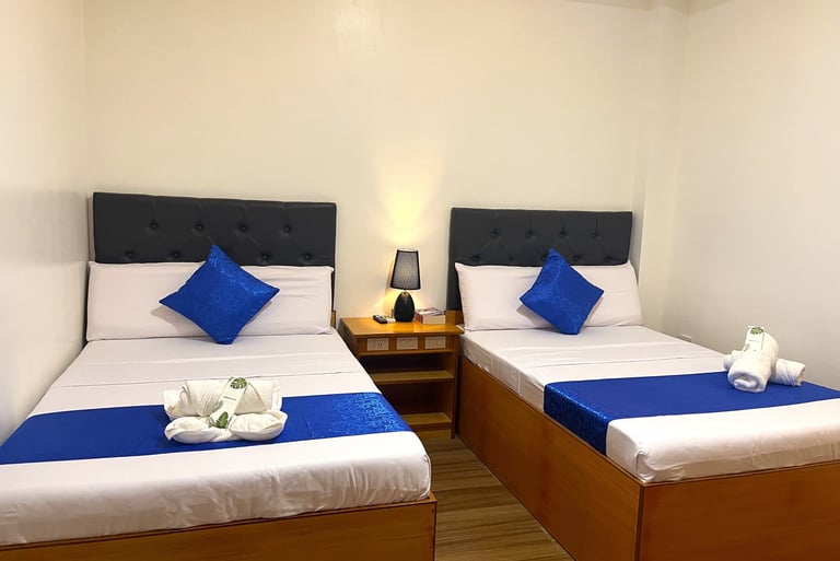 The room features one queen-sized bed for parents and two double beds for children, all outfitted with soft, high-quality linens for a restful sleep.